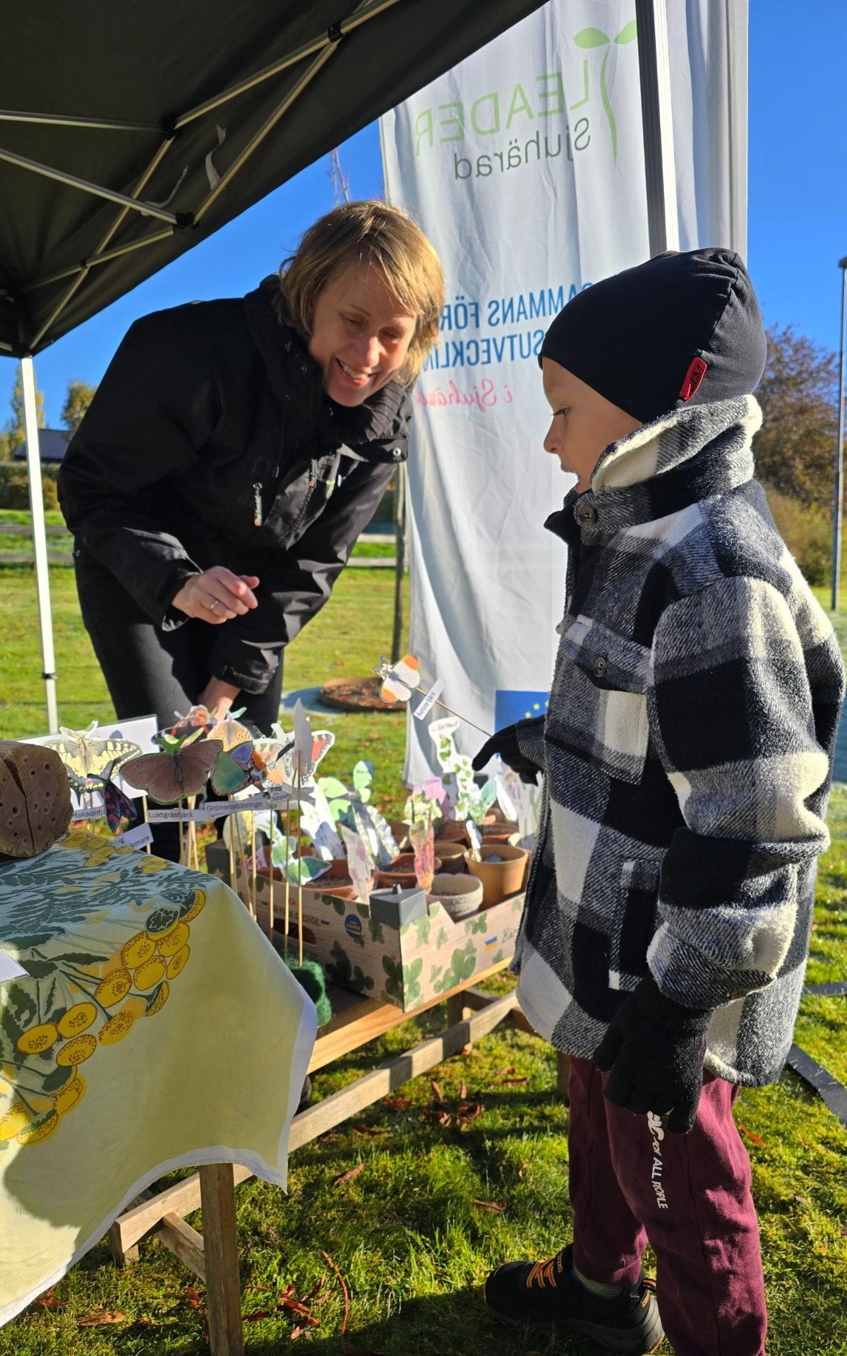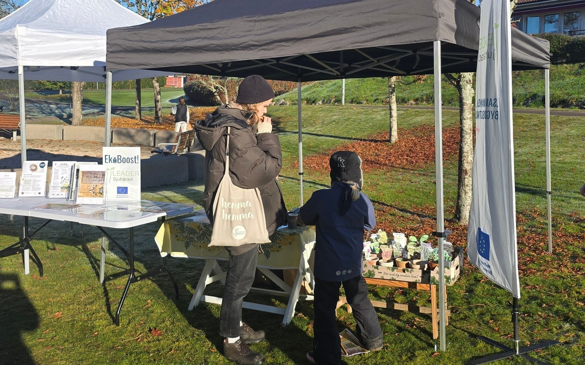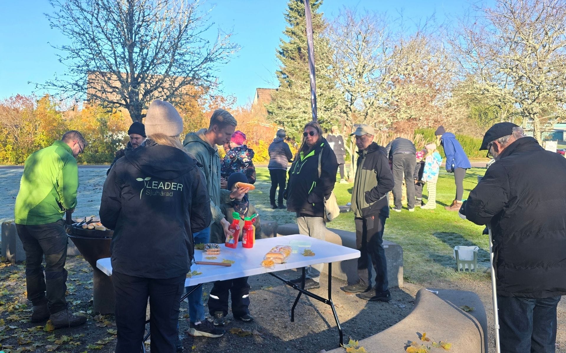 Äntligen har det blivit dags för invigningen av visningsplatsen i Erikstorp. Det är en strålande höstdag, soligt, lite kyligt och rimfost i gräset när folk börjar strömma till vid 10-tiden på förmiddagen. Andreas och Peter från Bollebygds kommun har laddat kaffetermosarna, tänt grillen och snitslat en klurig tipspromenad i området. Katarina och Linda från Leader Sjuhärad finns på plats med inspirerande informationsmaterial om mulholkar, insektshotell och andra tips på hur du kan gynna biologisk mångfald i din närhet. Nere vid bäcken står Johannes och Peter från Sportfiskarna redo med håvar för att visa på vad som lever i bäcken. Det är många intresserade i olika åldrar som hittat hit idag, mellan närmre 80 personer dyker upp under förmiddagen.