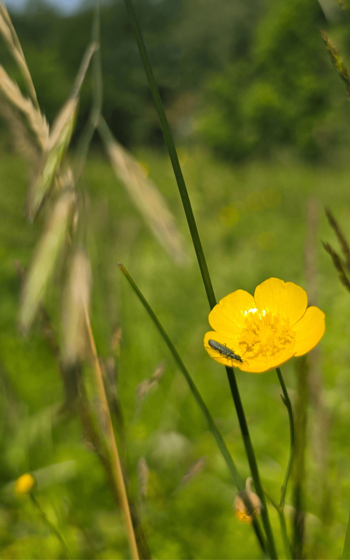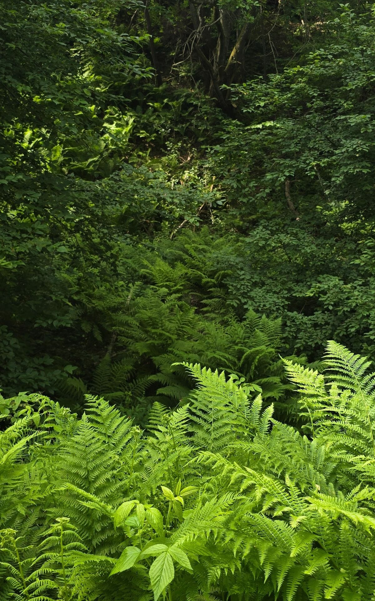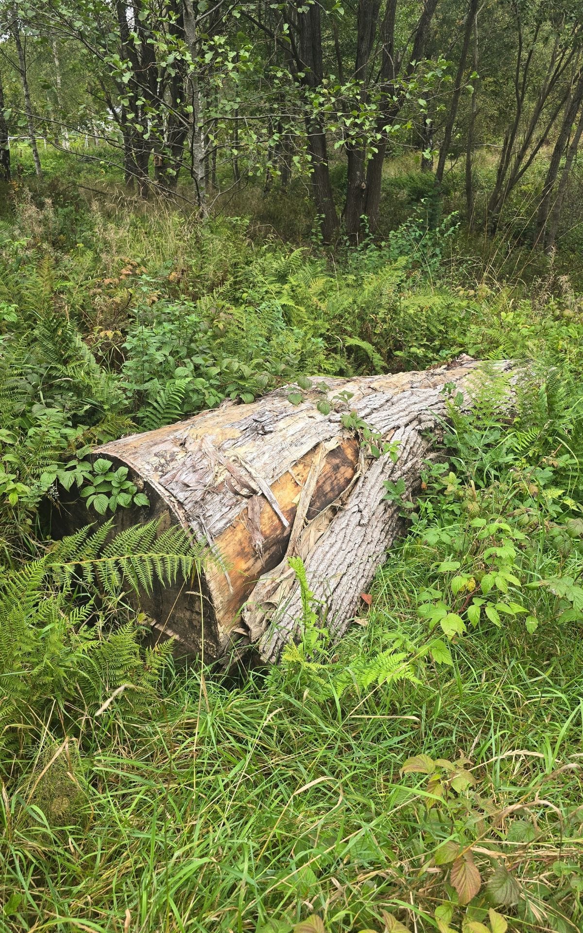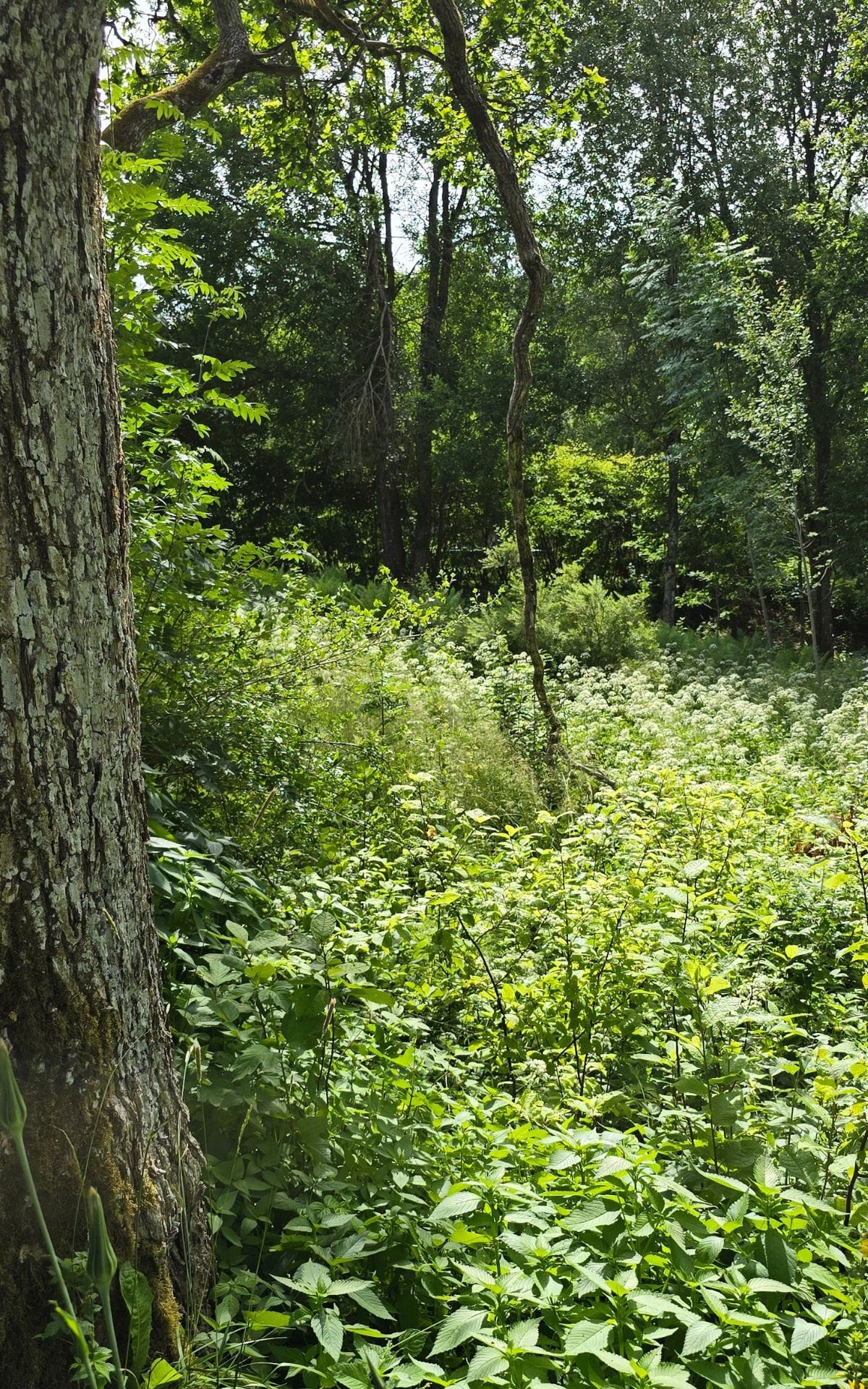 Vi vandrar vidare längs bäckravinen och tar oss ut i den frodiga havet av älggräs, hallon, vänderot och ormbunkar. Det är frisk och näringsrik mark på platsen och växtligheten är nästan ogenomtränglig på sina håll. Men ute bland grönskan fladdar mängder av bruna luktgräsfjärilar och en och annan pärlemorfjäril omkring, och invid bäcken syns en blåskimrande jungfruslända skymta förbi. Humlorna har fullt upp med att pollinera vildhallonen. Vi diskuterar vidare om hur området kan skötas på sikt, kanske kan en del av området skötas med slåtter för att öka mängden blommande växter, andra områden skulle må bra av att betas av får, medans andra delar ska få vara precis som de är utan någon tillrättalagd skötsel. Här kommer också att sättas upp några mulmholkar som skall gynna vedlevande skalbaggar, därför tittar vi också runt idag för att hitta lämpliga, solbelysta plats i närheten av gamla lövträd där det passa bra att placera dess.
