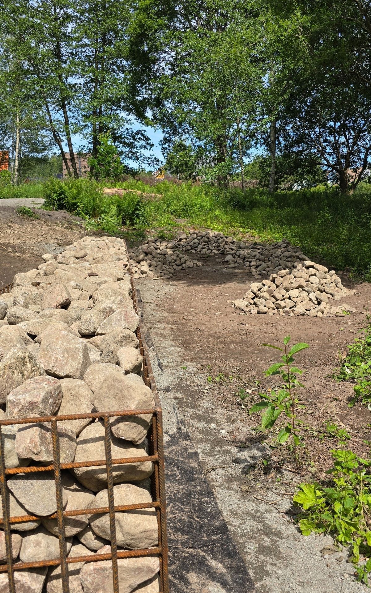 Det är en solig sommardag i slutet av juni när det är dags för ett besök i Erikstorp igen. Idag finns både Andreas Andersson, park & skogsförvaltare, och Peter Krahl, miljöstrateg från Bollebygds kommun på plats och möter upp i den frodiga grönskan. I dag ska de fortsätta det praktiska arbetet med att bygga faunadepåer i form av risstaket och röja undan en del sly i området. Men innan dess tar vi tillsammans en runda i området kring bäckravinen och tittar på vad som har hänt sen sist. Det stora projektet som påbörjats är anläggandet av en stenmur och stenrösen. Tanken är att muren och rösena ska bli möjliga biotoper för småkryp, ödlor och insekter. Eftersom muren måste vara säker och inte får rasa, är den inramad med gabionkorgar. Här diskuterade vi möjligheten att fylla på med jord uppepå och etablera en växtlighet, för att snabbare skapa en mer naturligar känsla. Det är feriearbeterna i kommunen som hjälpt till att färdigställa muren under de senaste veckorna. Runtomkring kommer så småningom växter etableras, antingen blir det spontant uppkommna växter, eller eventuellt insådd av någon ängsblandning.