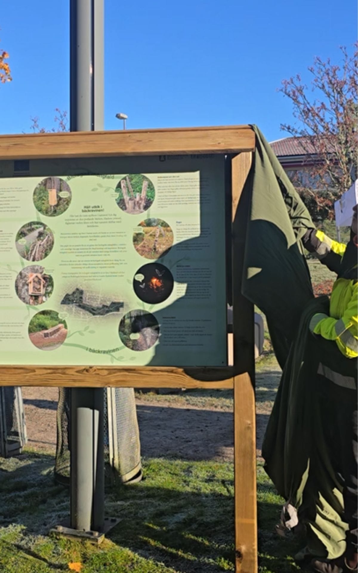 Vid klockan 10 är det dags för invigning, Andreas, Peter och Katarina berättar om idéen med visningsplatsen och hur den kommit till. Sedan är det dags för Sverre Fredriksson, tekniska nämndens ordförande, att klippa bandet in till visningsplatsen. Den fina skylten som berättar om innehållet på visningsplatsen avtäcks av Andreas.
