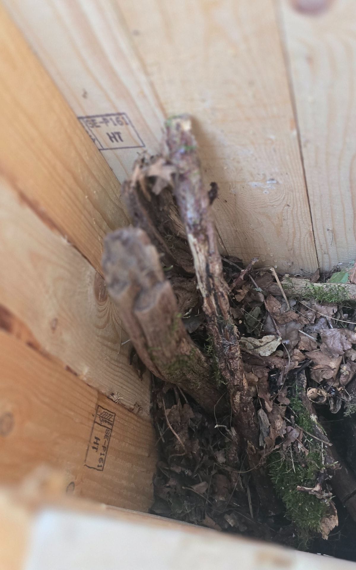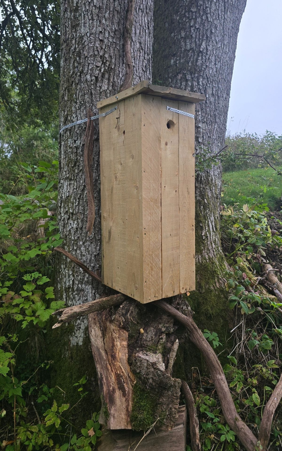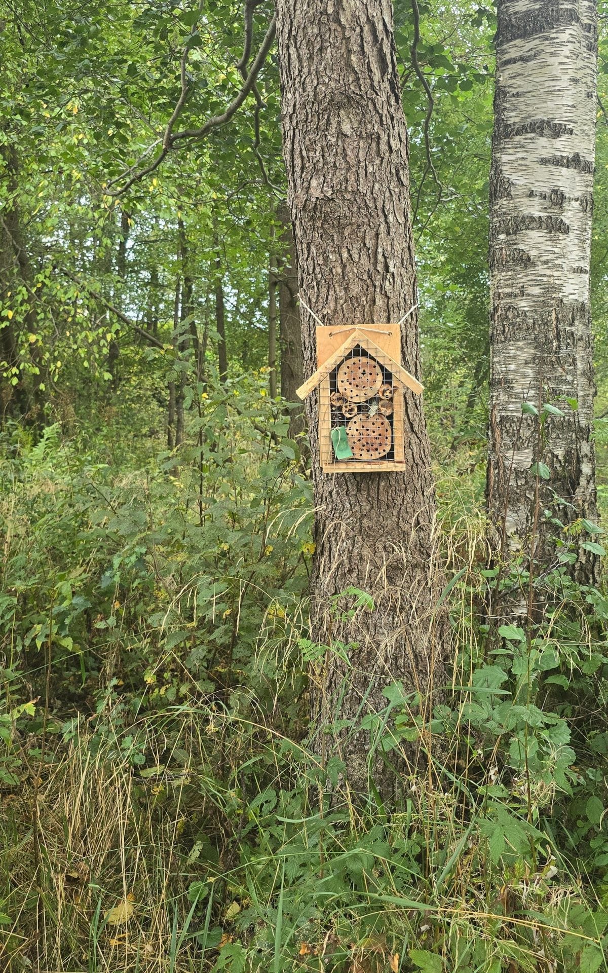 Andreas är i full färd med att sätta upp insekthotell och fågelholkar. Totalt har det kommit upp ca 40 olika holkar, både fågelholkar, fladdermusholkar, mulmholkar och biholkar/insektshotell. Vi tittar närmare på en av mulmholkarna som är placerad vid basen av en stor ek. En mulmholk är ett försök att skapa en miljö som efterliknar innanmätet i ett gammalt dött lövträd. Mulm är lös, finfördelad murken ved och ibland också rester av gamla löv, skalbaggsbajs och döda djur. Många olika skalbaggsarter behöver mulm, eftersom deras larver lever i och av mulmen. Mulmholken ser ut som en stor fågelholk (och kan också användas som en sådan) men den är fylld med gamla löv och murket trä, och i taket finns hål som gör att det komma in lite vatten så att det blir lagom fuktigt där inne.