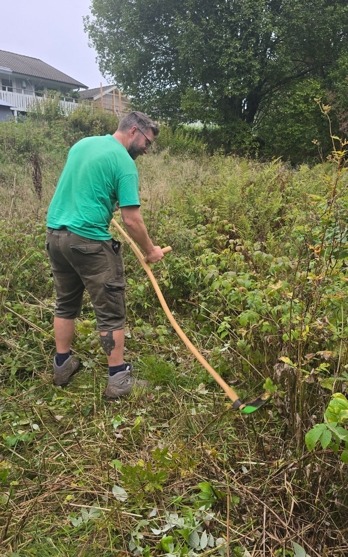 Lite längre ned längs gångstigen hittar vi Peter som med lie håller på att röja fram en liten stig mellan älgräs, hallon och ormbunkar. Här är tanken att man framöver ska kunna smyga fram omsluten av hög vegetation och på så sätt kunna komma nära växter och småkryp och upptäcka naturen på nära håll.